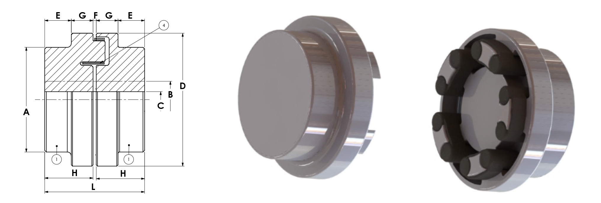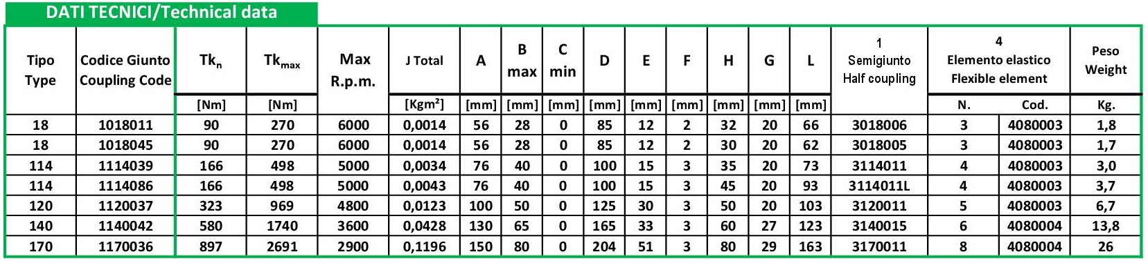 This type of coupling allows absorbing shocks and torsional vibrations, the elastic round-shaped inserts work under compression ensuring coupling’s self centering
