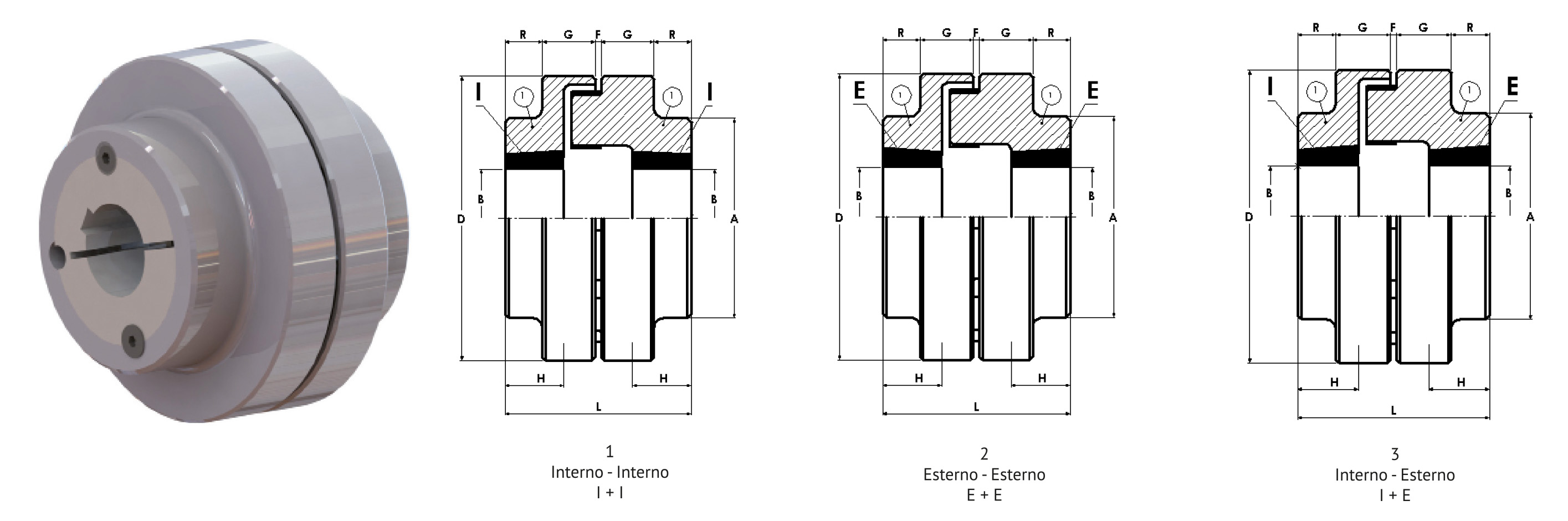In placing an order, please specify the coupling code, the diameter of the shaft “B”, the clamp “Internal” or “External”.