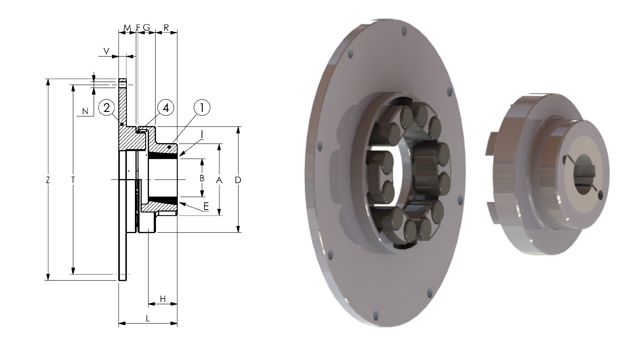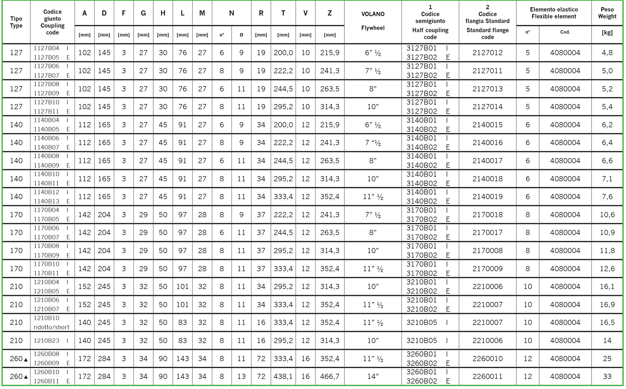 This type of coupling allows absorbing shocks and torsional vibrations, thanks to the elastic round-shaped inserts that work under compression and ensure hub and flange self centering GTBF flexible coupling with flanges for SAE flywheel, with tapered bush fixing, are ideal for agricultural (motopumps) and industrial applications.