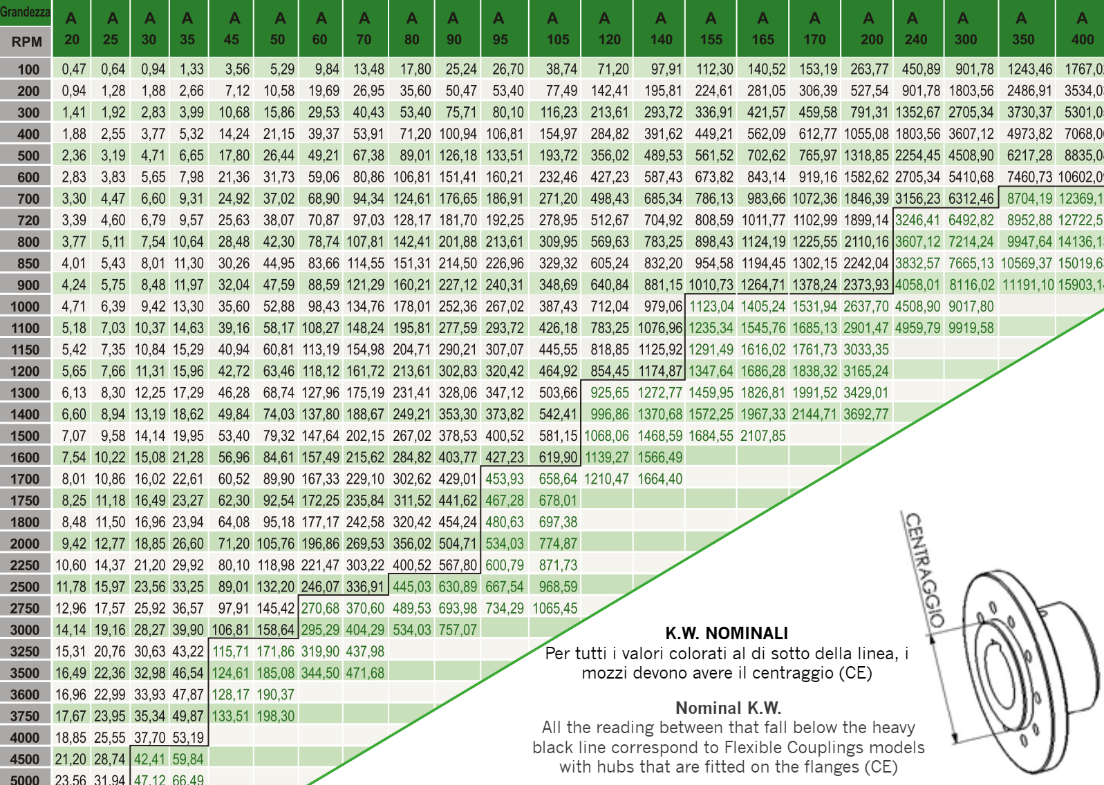 A quick way to select the coupling is to multiply Kw by the service factor, place in the speed row and place in the box with a number higher than determined in kw by fs. In the table there is a scale line below which that represents the speed limit of hubs without centering, below which the hubs must have centering.