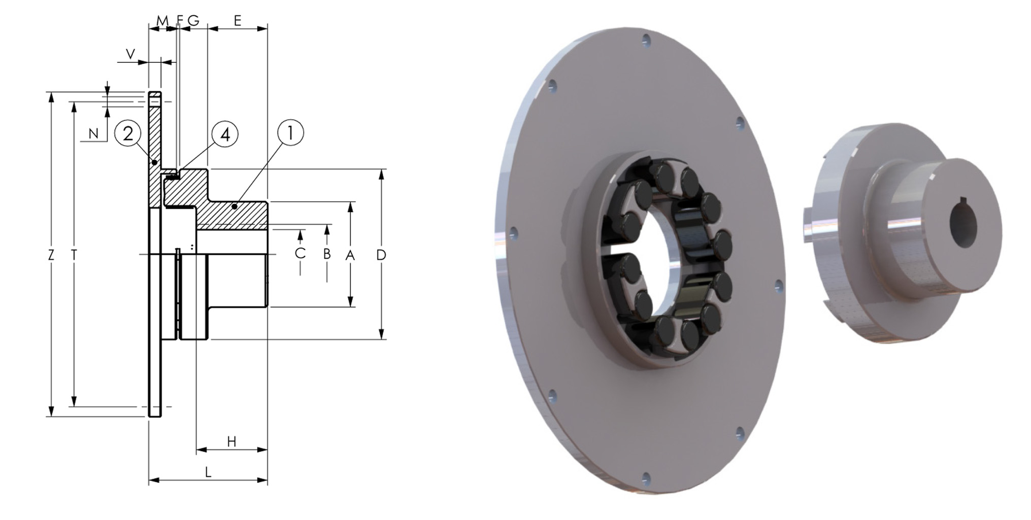 This type of coupling allows absorbing shocks and torsional vibrations, thaks to the elastic round-shaped inserts that work under compression and ensure hub and flange self-centering The standard machining involves the milling of the teeth which offers the following advantages: