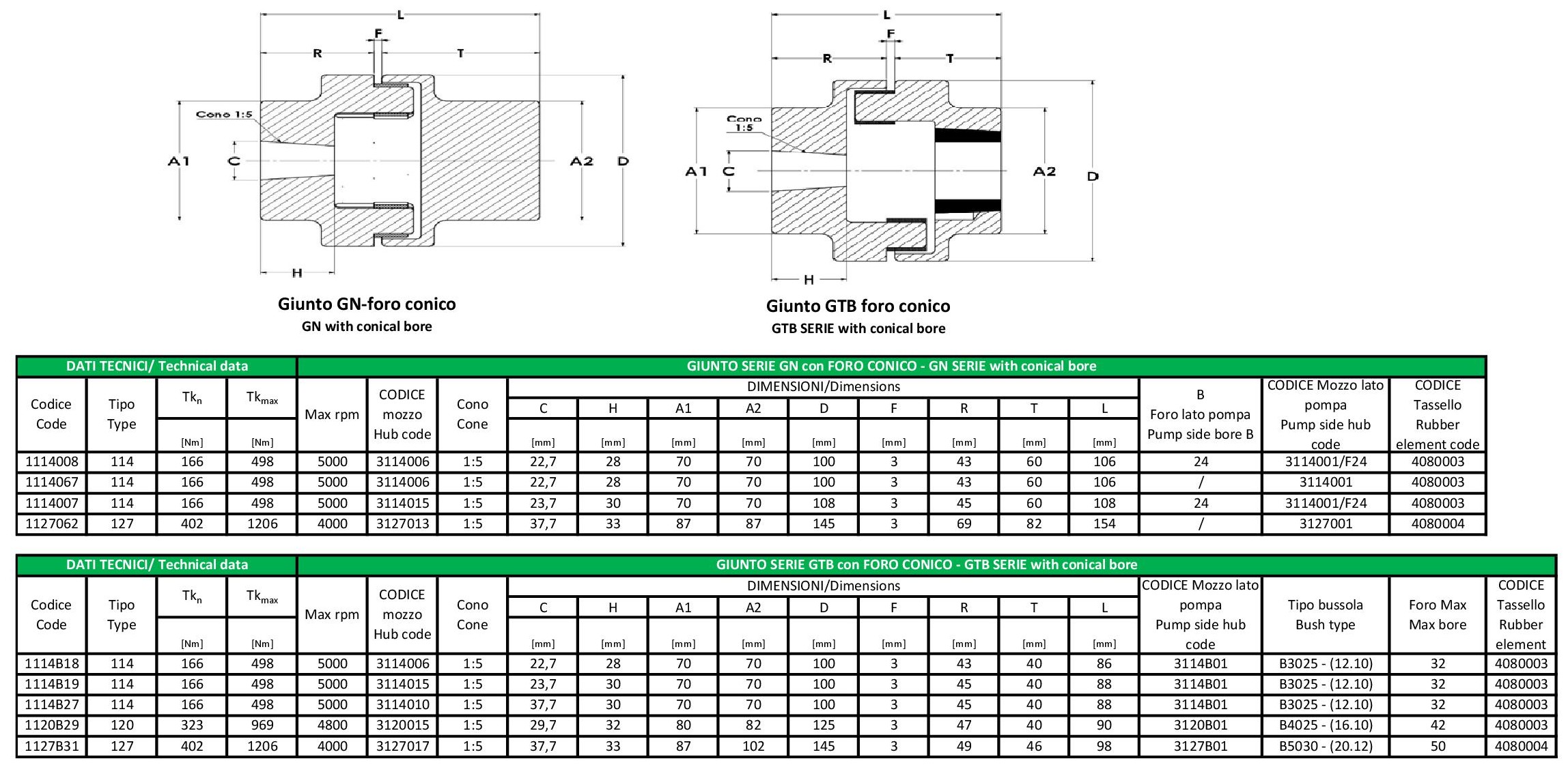 The couplings GN for conical shaft are supplied with conical bore and normal hub on pump site and the GTB Fconico equipped with hub with conical bore and a hub with taper bush .